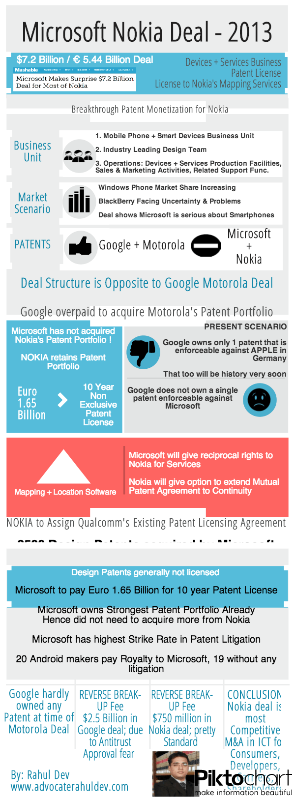 Original article source: http://wp.me/p2PCVq-NM Nokia Microsoft Deal & Smartphone Patents – Summary & Differences with Google Motorola Deal Brief facts and analysis: Amount paid by Microsoft to Nokia: $ 7.2 Billion / Є 5.44 Billion Acquisition includes: Nokia's Devices & Services business Mobile Phones and Smart Devices business units Industry-leading design team Operations: Nokia Devices &… Continue reading M&A Review: Nokia Microsoft Deal & Smartphone Patents – Summary & Differences with Google Motorola Deal
